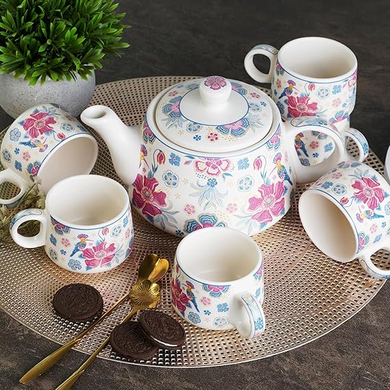 Ceramic Handcrafted Botanic BlissTea Morning Set – 1 Kettle (1 Litre) & 6 cups