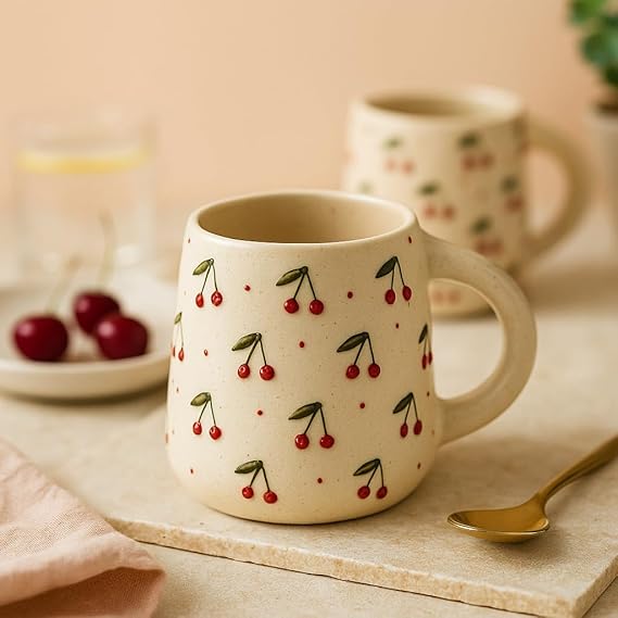 • 🏠 Aesthetic Kitchen Decor – Set of 2 Premium Ceramic Mugs Add a touch of elegance to your home kitchen, café setup or office desk. The soft cream base and cherry accents blend with modern & cottagecore interiors.