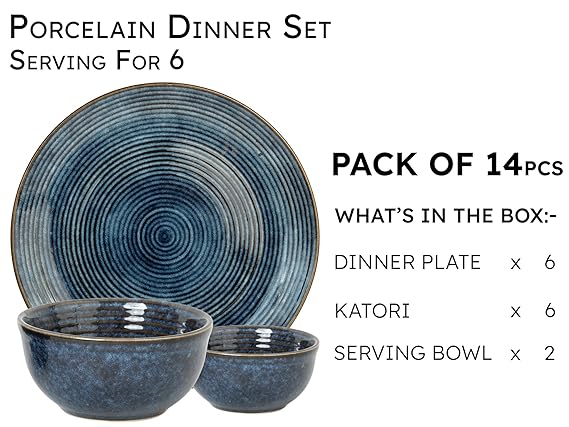 - WHAT’S IN THE BOX: 14-piece ceramic dish set Serving for 6 – Includes 6 Dinner Plates (10.6-inch) | 6 Bowls/Katori (4.4-inch and 180-ml) | 2 Serving Bowls (6.9-inch and 1000-ml).